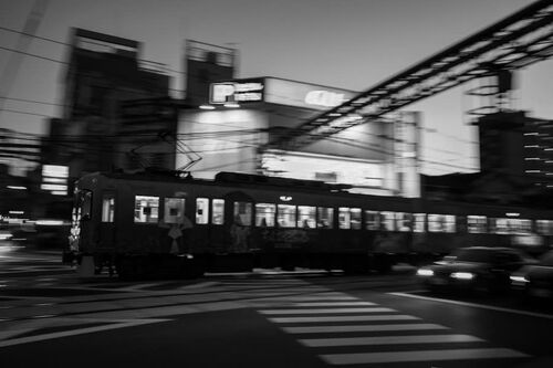 SONY α7II + MC-11 + SIGMA 10-20mm F3.5 EX DC HSM 暮れなずむ浜大津 街明かりが灯り始めた中を走る京阪電車