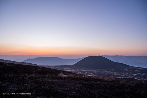 こんにちは、潔く銀です。草千里ヶ丘を散歩したとは、野焼き直後の米塚を撮影することにしました。狙いは、マジックアワーの中の米塚です。