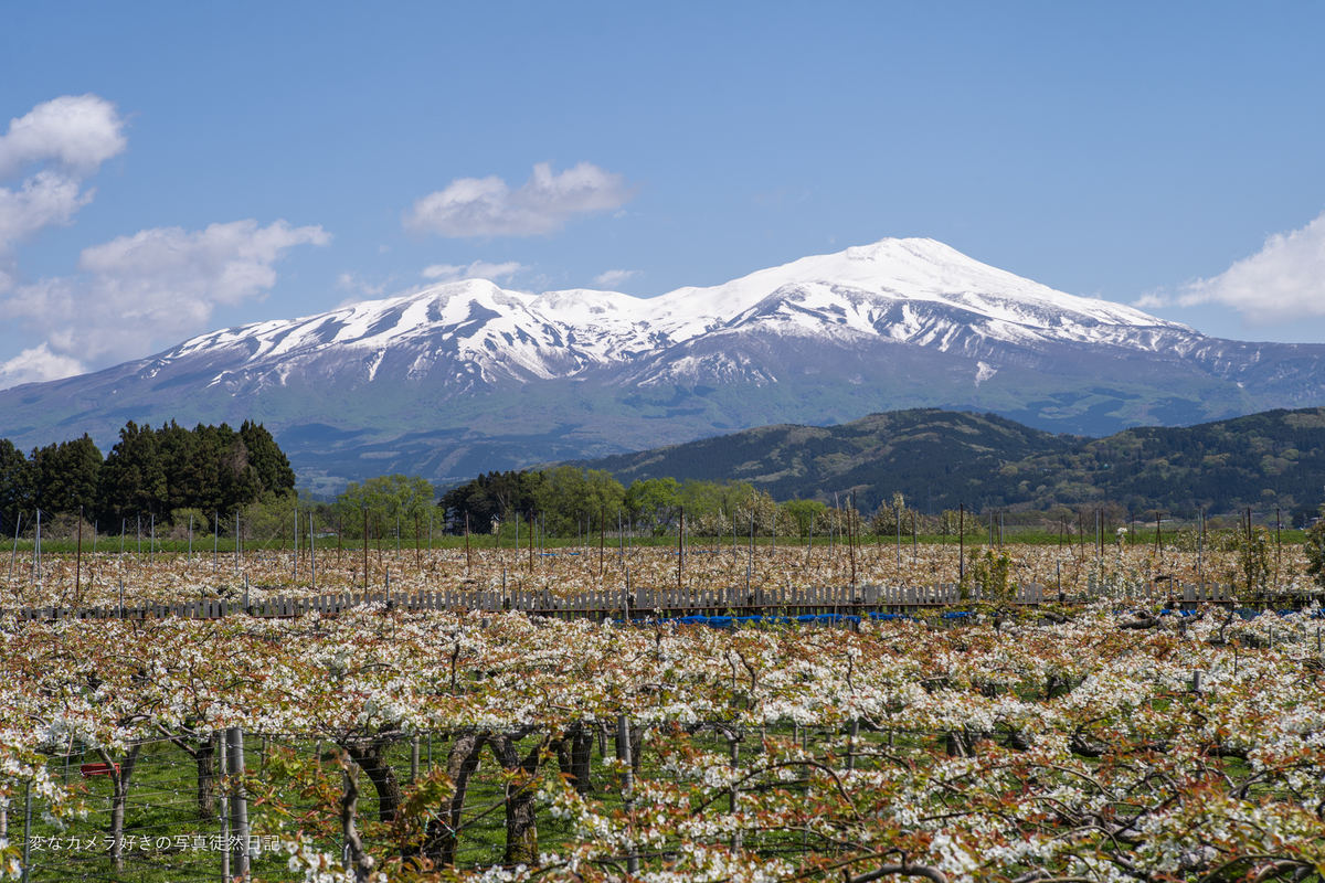 移動中、数人のカメラマンがいたので立ち止まって撮影。一面に花が咲いているところがあり、奥には鳥海山が見えるポイントでした。花は、桜でしょうか。撮影場所は忘れてしまいましたが、同種の花が咲いているところは結構ありました。