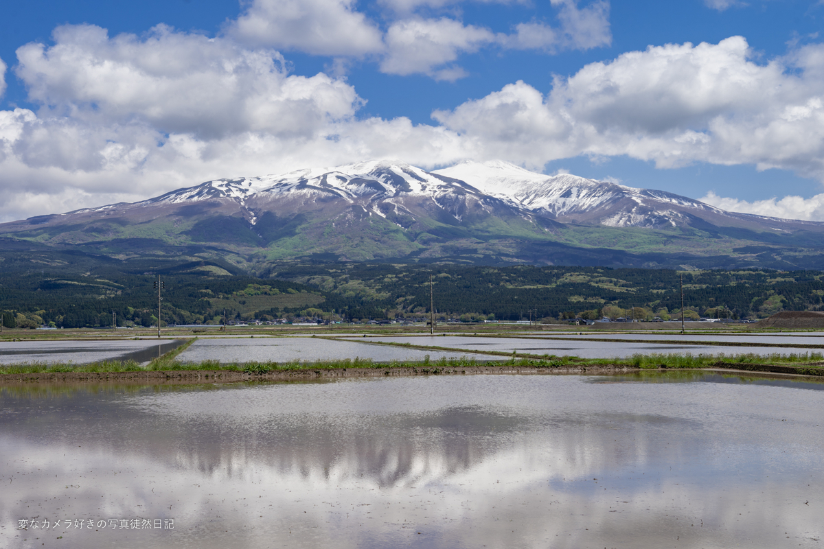 この写真を撮影しているときに、ちょうど田んぼに水が入っているところがあることに気づき、水鏡で鳥海山を撮れるところを探すことにしました。