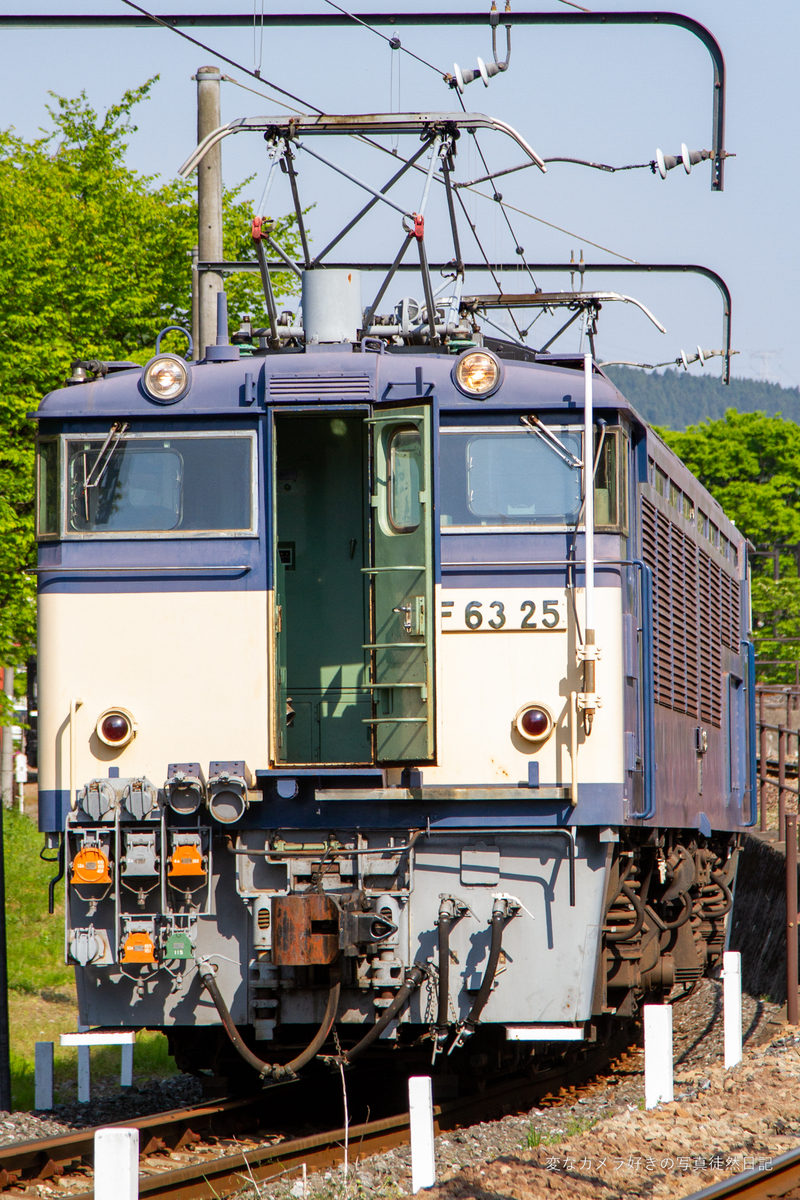 EF65を撮影しているとEF63が走ってきたので撮影しました。冷房が無くて暑いからでしょうか、貫通扉全開でやってきました。今日は稼働していないEF63達と絡めて撮影しました。