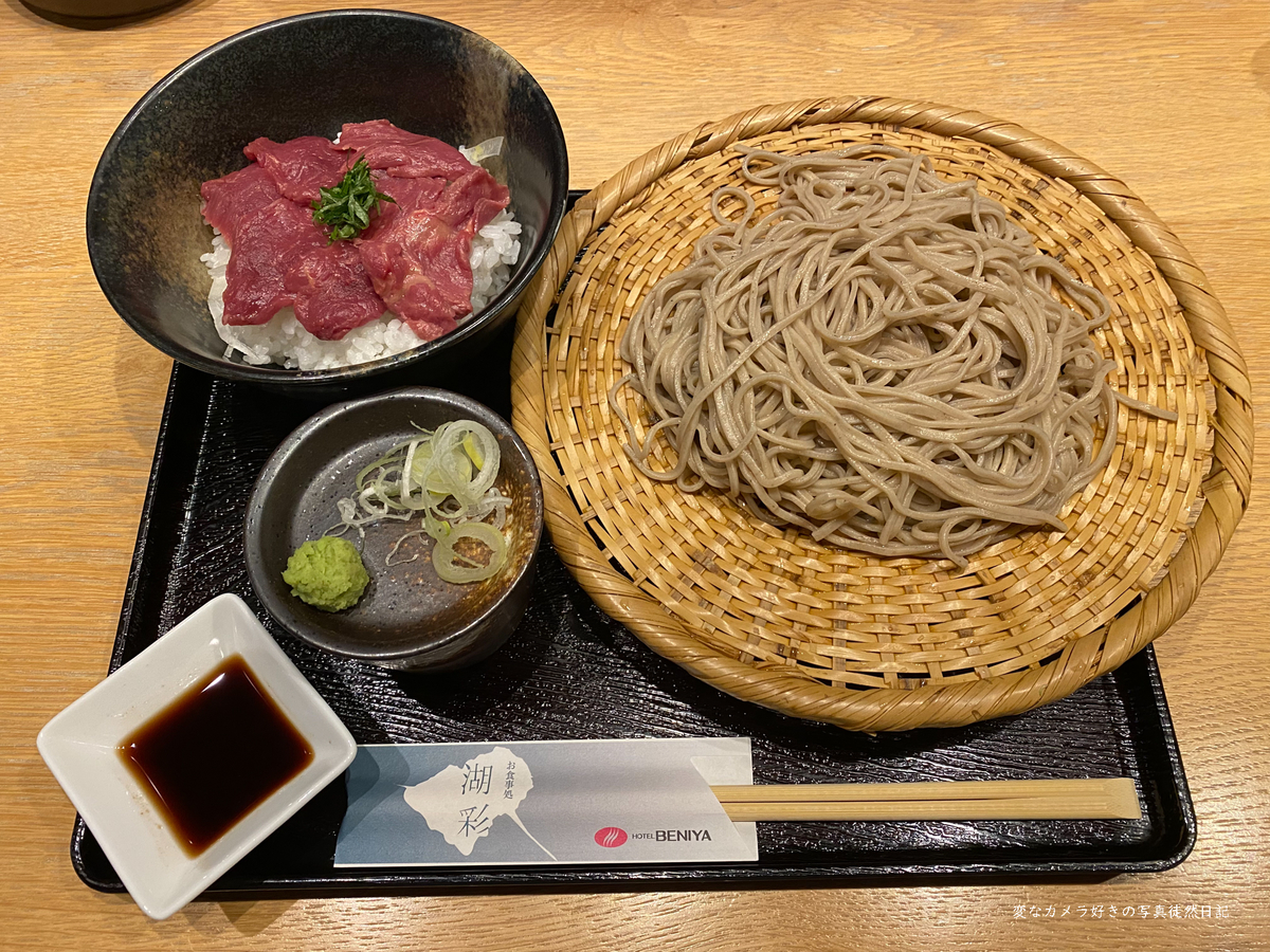 ここでは、お蕎麦と馬肉丼を食べました。熊本で結構馬刺しを食べているので、ここにきて馬刺しを食べる必要はなかったのですが、丼になっているのは初めてだったので気になって選んでしまいました。意外と丼もいけておいしかったです。