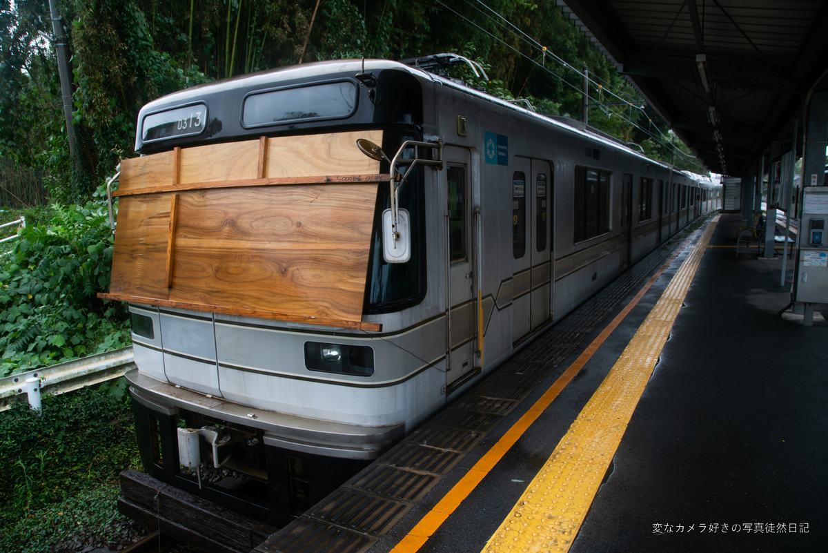 最後に、びちょびちょになりながら台風対策された2編成を撮影しました。6211Aに取り付けられている板は、どこかの看板のような板ですね。今になって思いますが、これらの板は急増で作られたものなのでしょうか・・・少し気になるところです。