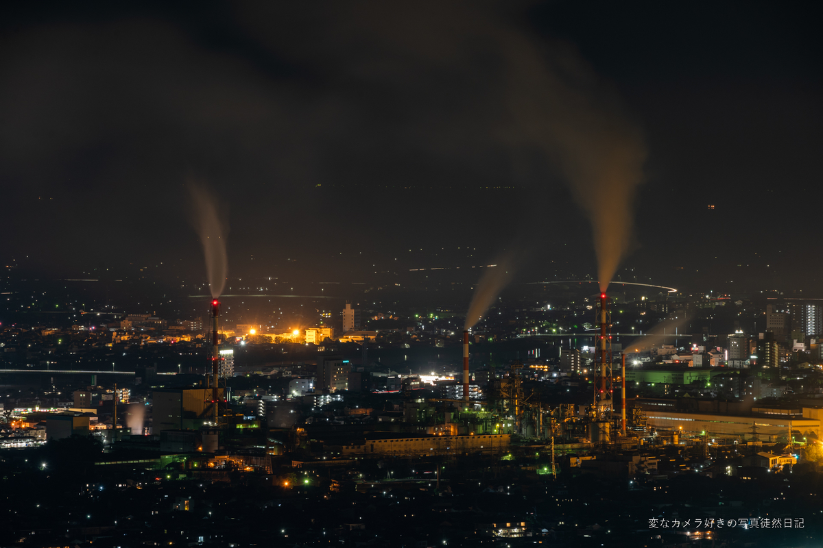 レンズを超望遠に変えて撮影しました。工場の一部のライトは、DOレンズのせいで緑になっているのかな?と思っていましたが、どうやら水銀灯がまだ現存しているようです。最近、LEDの街灯に変わっているところが増えているので、水銀灯はレアだったりします。