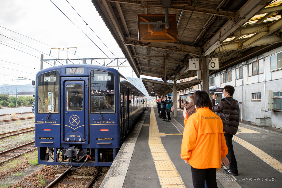写真は、肥薩おれんじ鉄道のホームに入線するおれんじ食堂です。ちょうど、運転日だったようです・・・いつかは乗りたいところです。