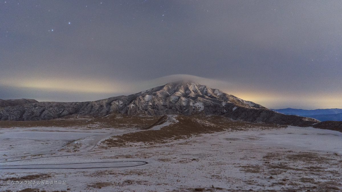 少し前に雪道走行の練習をするために訪れた草千里ヶ丘での写真になります。平日の深夜は、ほとんど車がいないので練習にはもってこいです。また、車に邪魔されないので景色の写真も撮りやすいのがメリットです。ただ、デメリットは翌日の仕事に響くことですがw
