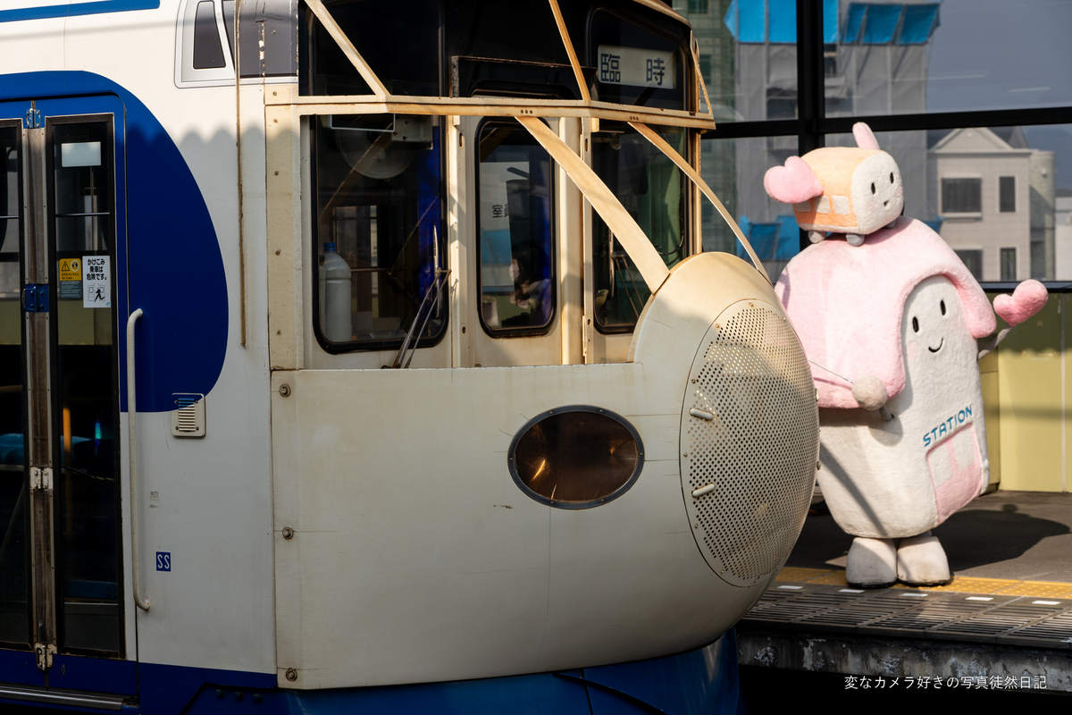0系をモチーフにして作られた鉄道ホビートレインが撮りたくて、前に移動するとすまいるえきちゃんというゆるキャラが、ちょうど車両の横に来たので記念写真を撮影しました。この後は、乗車していたであろう子供たちと記念写真タイムになったので、撮影会が始まる前に撮影することが出来てよかったです。