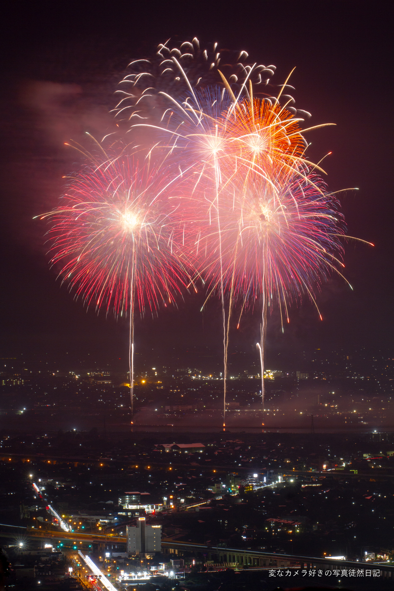 いつものサブカメラ、SONY α7RIIがバッテリー上がってしまったので、急遽EOS7Dを取り付けて撮ることにしました。これでどちらの機材もレンズは一軍になりました。15年前のカメラのためダイナミックレンジが狭く、すぐに白飛びしてしまうためアンダー気味に撮影しています。キヤノン機は昔から赤色がすぐに飽和する傾向があり、写真のような花火はその弱さが露呈してきます。